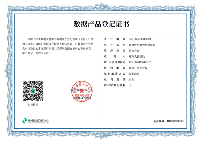 据介绍,在“缺血性脑血管病数据集”产品研发过程中,郑州人民医院联合郑州数据交易中心成立了工作专班,结合市场需求与医疗数据现状,综合考量数据业务价值、原始数据暴露情况等因素,确定了适配相关场景的数据产品形态,并协同律师事务所、资产评估机构等专业服务机构,系统推进数据合规评估、数据质量评估及数据资产价值评估工作,最终完成该数据产品的登记挂牌,为医疗数据创新应用提供实践范例。